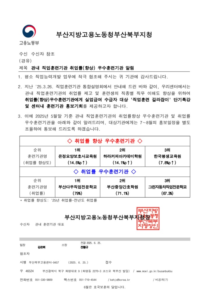 부산 북부 직업훈련기관 취업률(향상) 우수훈련기관 알림