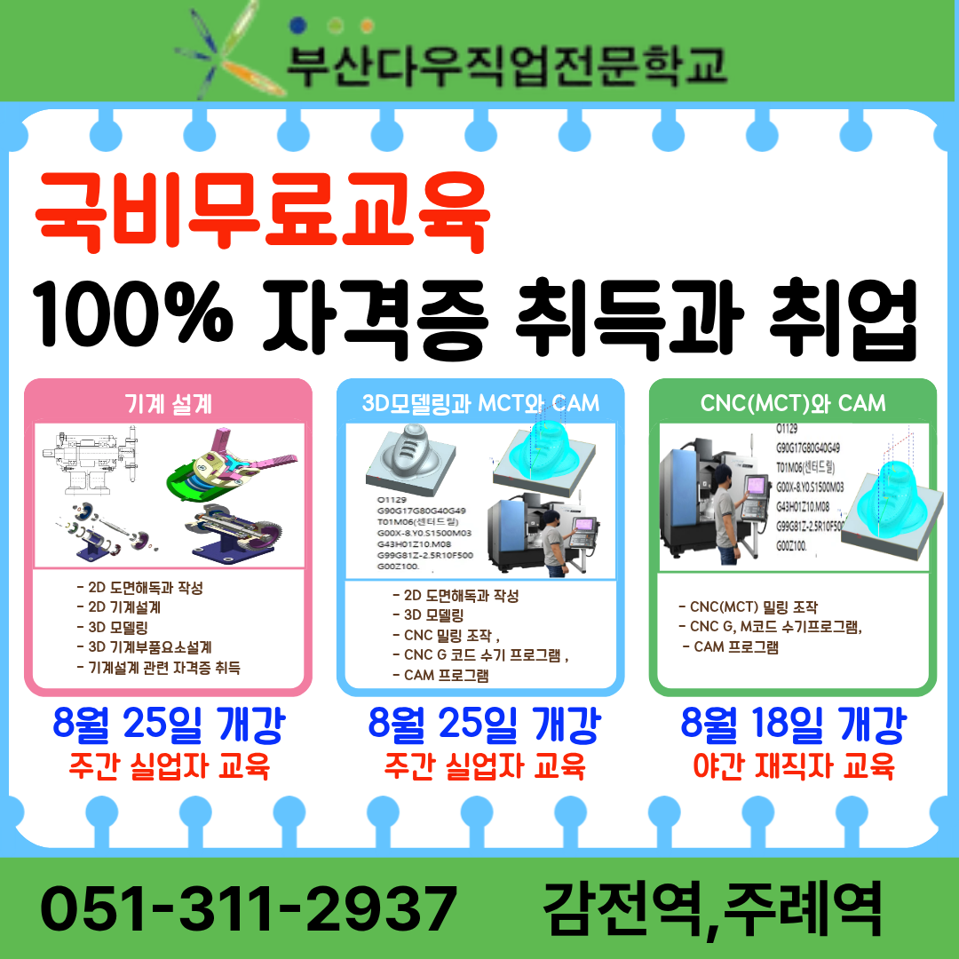국비 지원 무료 교육으로 자격증 취득하고 취업하자!! 기계설계와 기계설계산업기사 *. 개강일 : 8월 25일 월요일 * 교육기간 : 120일 6 개월 *.교육시간 :09시~18시 주간교육 *. 교육비 : 국비 무료 *. 훈련 장려금 지급 *. 과정교육내용 - 2D 도면해독과 작성 - 2D 기계설계 - 3D 모델링 - 3D기계부품요소설계 3D모델링과 CNC(MCT)조작과 CAM프로그램 *. 개강일 : 8월 25일 월요일 * 교육기간 : 89일 4.5개월 *.교육시간 :09시~18시 주간교육 *. 교육비 : 국비 무료 *. 훈련 장려금 지급 *. 과정교육내용 - 2D 도면해독과 작성 - 3D 모델링 - CNC 밀링 조작 , - CNC G 코드 수기 프로그램 , - CAM 프로그램 CNC(MCT)조작과 CAM프로그램 *. 개강일 : 8월 18일 월요일 * 교육기간 : 40일 2개월 *.교육시간 :18시 30분시~21시 30분 야간교육 *. 교육비 : 국비 지원 *. 과정교육내용