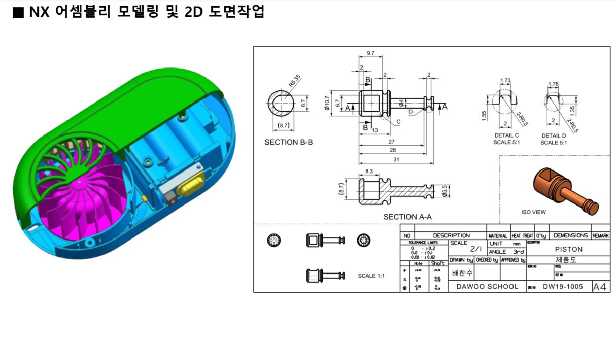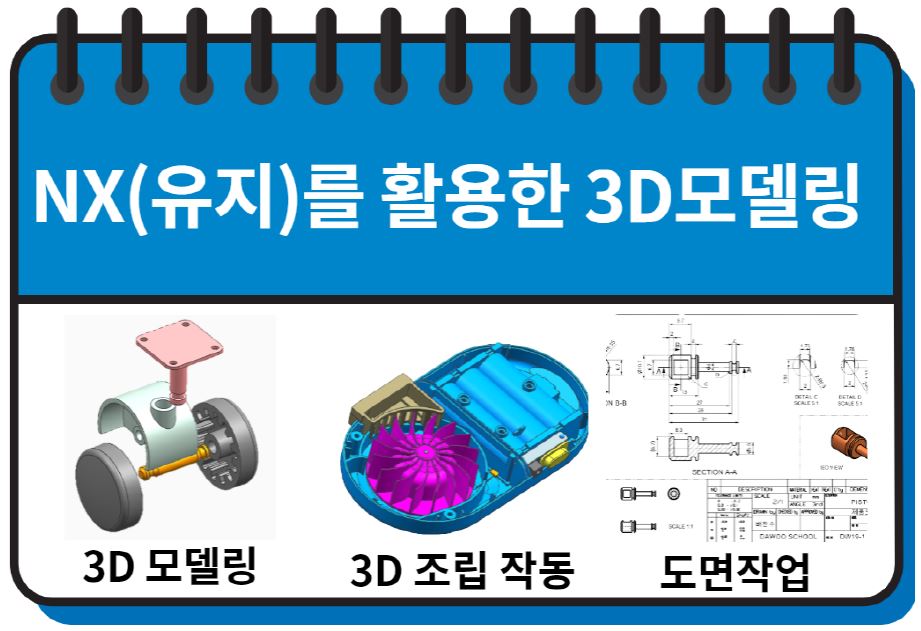 - NX 모델링(2D Curve, 스케치, 솔리드모델링, 동기식 모델링, 서피스 모델링), 어셈블리, 드래프트,3D 프린터