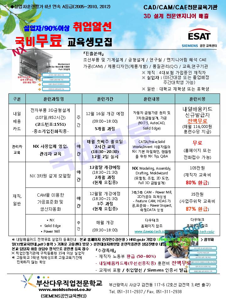 [실업자계좌제]전액무료 5개월 전자부품 3D금형설계 12월16일 개강