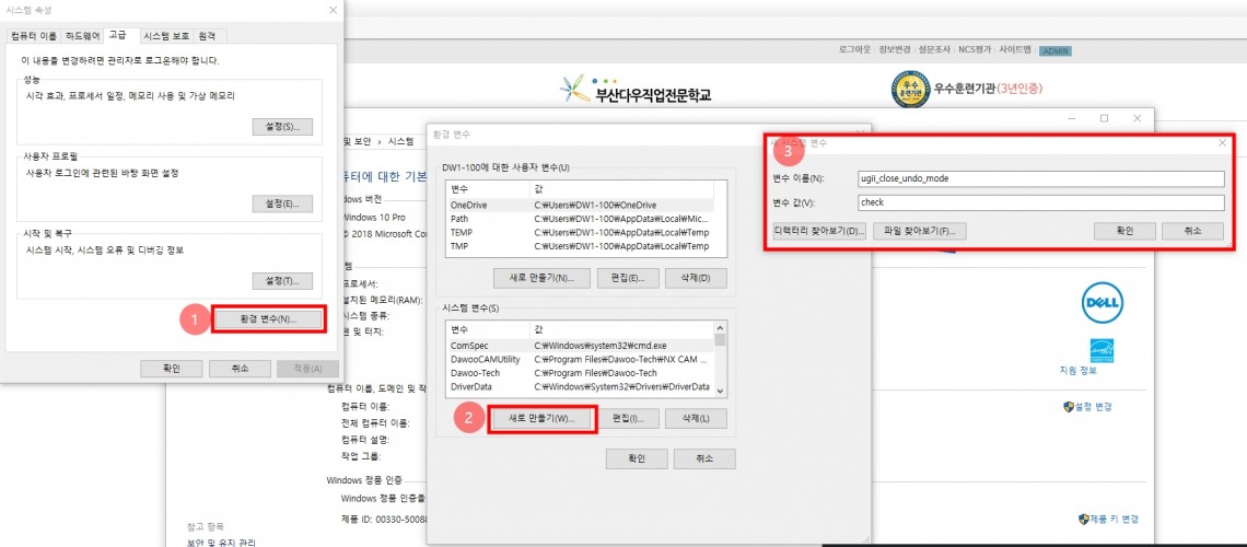 1. 내컴퓨터의 "속성"(MB3) 누르고 -> 2. 고급시스템 설정 -> 3. 고급 -> 4. 환경변수 -> 5. 시스템 변수 -> 6. 새로 만들기 ->