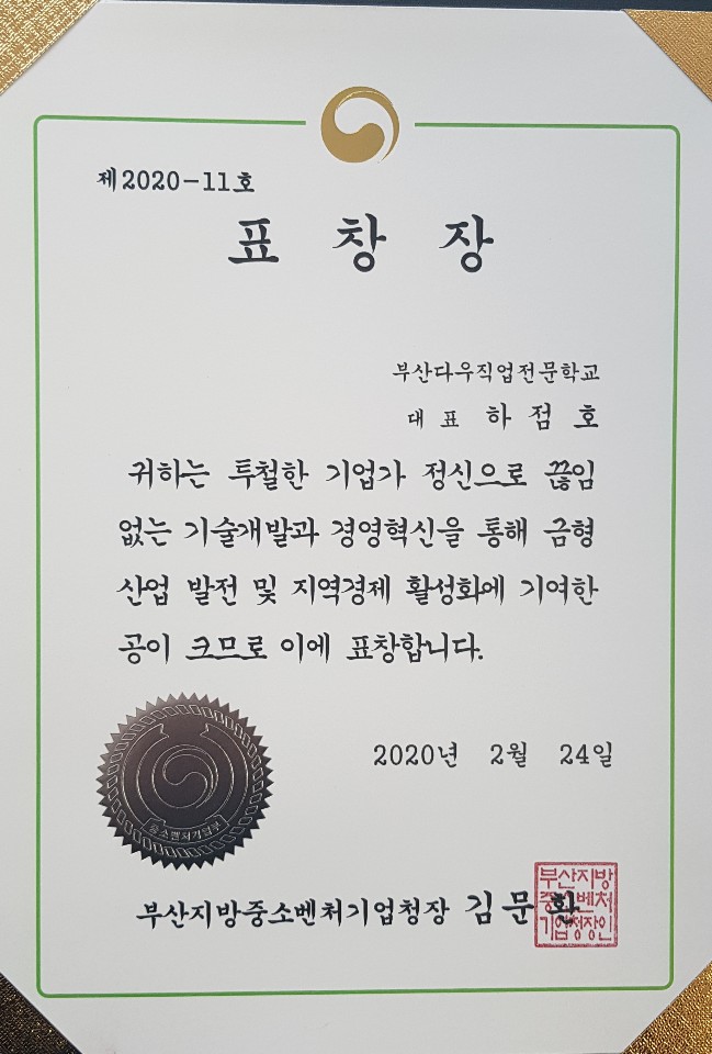 부산지방중소벤처기업청장 하점호 표창장